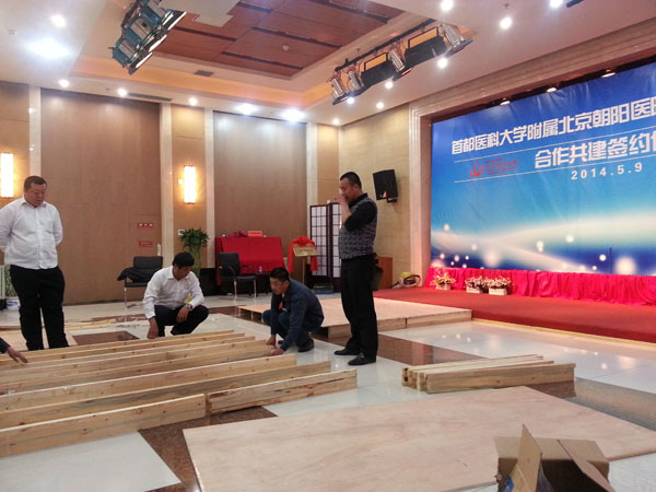 时间倒回至5月8日晚10点,“河北燕达医院与北京朝阳医院合作共建协议签约仪式”进入倒计时阶段。多功能厅此时已全面布置完毕。由于此次仪式级别较高,因此受到河北各级领导的高度重视,为确保会议正常、高质量的召开,参与本次活动的河北省领导在河北燕达医院领导的陪同下,再次到现场确认了会场的布置情况。考察后,省领导当场做出工作指示,希望能在现有基础上加以调整:推翻原有布置方案,将已安装就位的背景板抬高40公分,将主席台全面向外延伸2.5米距离,更换签约椅、讲话台等等。