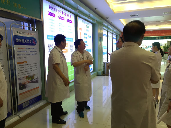 本次窗口部门优质服务月活动的重点工作之一就是优化诊疗环境。7月10日当天,在组长姜合作院长的亲自带队下,医务部、护理部、医院办公室、门诊部、信息科、药剂科、感控科、功能科、财务收费处、医保办等相关负责人共同对医院一至三层的门急诊、医技楼等区域进行了深入细致的走访,重点针对门诊区域宣传物品的摆放、导视标识的设置进行了一次系统化、规范性的梳理,各部门纷纷表示:姜院长亲临一线做如此细致入微的走访,传递出院里对于此项活动的高度重视,通过走访,不仅点明问题、明确责任、更是留给大家在未来能够改进的方向与空间。