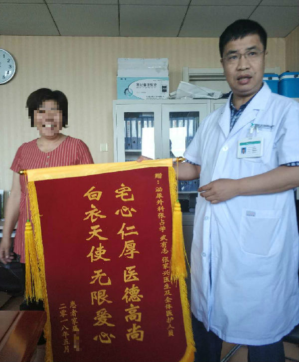 来自北京的张先生在燕达医院泌尿外科杨云波主任的主刀下,一次成功实施肾囊肿去顶术、前列腺电切术、尿道外口成形三项手术,有效减轻了张先生的病痛,缩短了的恢复周期,令张先生十分满意。住院期间,对刘桂迁细致入微的关怀照顾也十分感谢,送上锦旗。