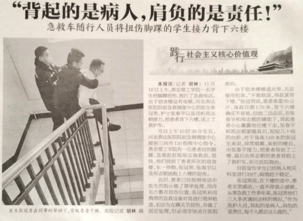 目前,受伤学生已经转入燕达医院骨科进行治疗,由于送治及时,该学生病情已趋于稳定。张冠男说,在下楼的途中,患者非常感动,一直不停表示感谢。“作为医护人员,背起的是病人,肩负的却是责任,每个人都会这么做。”从事急救工作多年来,张冠男及其搭档们多次遇到类似情况,每次都是“医者仁心”的本能让他们毫不犹豫地背起了病人。