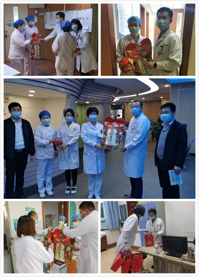 2月11日年三十当天,河北燕达医院常务院长周丁华、行政副院长兼党总支书记李文江、人力资源总监钮校臣、医务部主任王立等院领导与总值班一道深入门诊诊室、科室病区及后勤保障部门,亲切慰问了节日期间坚守在工作岗位上的一线值班人员,为大家送上新春问候和美好祝愿。期间,重点对坚守在疫情防控最前沿的发热门诊、隔离病房及预检分诊等岗位工作人员进行了亲切慰问,周丁华院长对大家在特殊时期坚守岗位、不辞辛苦、夜以继日的辛勤工作和付出表示了肯定,并希望大家严把出入关口,做好疫情防控的同时加强自身防护。