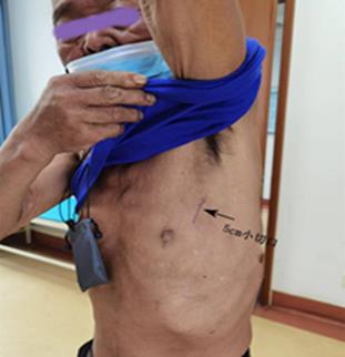 手术麻醉清醒后,患者呼吸顺畅、胸痛明显减轻,能够有力咳痰,没有出现并发症,很快康复出院。手术后一个月,当老人健步走进门诊复查时,当老人健吴骏主任差点儿认不出来这位曾经“重危”的患者了。有听力和语言障碍的黎先生虽然无法用言语表达对医护人员的感激之情,但每逢吴骏主任查房,他都会笑着一直竖着大拇指,这无疑是对吴骏主任及其团队最大的褒奖(图5、6)。