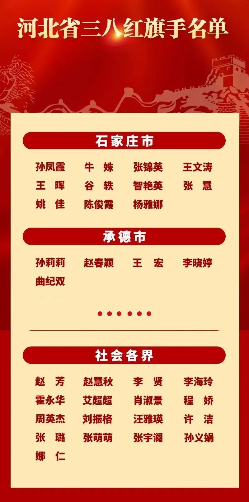 为表彰先进、树立典型,充分发挥先进典型和模范人物教育人、鼓舞人、引领人的重要作用,进一步引领激励广大妇女跟党奋进新征程、巾帼建功新时代,近日,省妇联决定授予武彦荣等10人河北省三八红旗手标兵称号,授予孙凤霞等140人河北省三八红旗手称号,授予石家庄市公安特警支队女子勤务大队等100个单位河北省三八红旗集体称号。