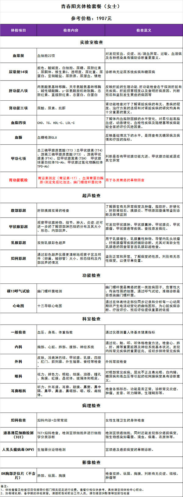 青春阳光体检套餐(女士)