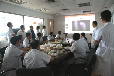 8月18日七点刚过,燕达医院骨科医生办公室内挤满了医生、护士,他们有的喝着米粥、豆浆,有的啃着包子、油条,还有的放下手中的早点在认真做着笔记……无论手中的早餐多么美味,此刻大家都在认真地看着PPT投影,听着刘清和主任的讲解与点评,并时不时地参与讨论,这里进行的
